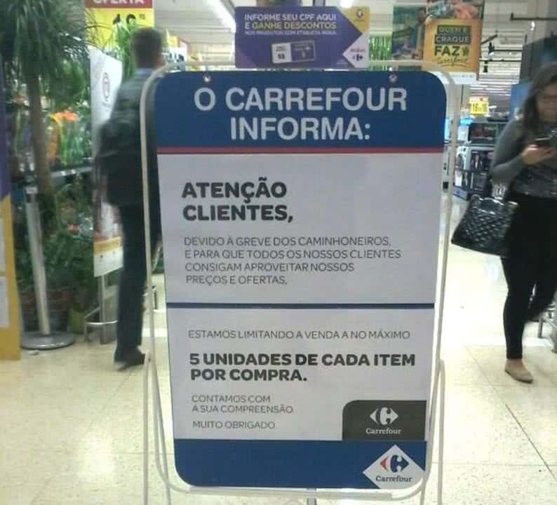 A rede de supermercados Carrefour teve que limitar suas unidades situadas no DF a restringirem 5 unidades de cada produto por cliente. A rede está tentando fazer contato com produtores locais para resolver a questão do abastecimento. Os principais produtos que estão ficando cada vez mais limitados são: frutas, verduras, legumes e carnes.
