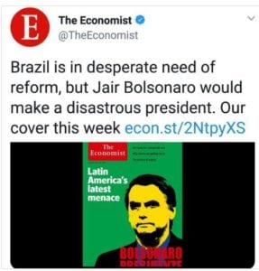 Segundo a revista Britânica, que traz na capa, junto a foto do presidenciável, o seguinte título: “A mais recente ameaça da América Latina”, um possível governo de Jair Bolsonaro seria desastroso ao Brasil e a América Latina. O mote principal para a crítica é o afã ditatorial do candidato de extrema direita, a revista fala, mesmo, em avanço do “populismo”. Bolsonaro teria sabido manipular os sentimentos nacionais, com sua pregação direitista, diante da crise política, econômica e social prometendo uma salvação, quando na realidade é uma ameaça, que tende a aprofundar essa mesma crise.