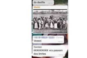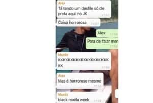 As mensagens criminosas foram postadas na internet (veja abaixo). Um jovem mentecapto identificado como Alex iniciou a saraivada de imbecilidades com comentários racistas. “Está tendo um desfile só de negra aqui no Shopping JK. Coisa horrorosa”, diz. Em seguida, um outro participante do grupo pede para ele parar de falar ‘merda’. Não contente com a estupidez do mentecapto, uma outra pessoa ignóbil identificada apenas como Muniz aparece apoiando as ofensas com gargalhadas. “Mas é horroroso mesmo. Black moda week”, considera. Após as considerações, Muniz posta uma foto de escravos enfileirados e compara a imagem com as jovens. Na sequência, outras duas pessoas aparecem zombando das modelos.