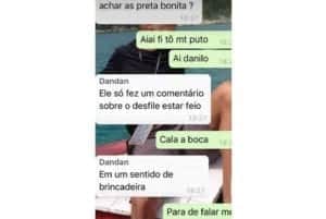Por conseguinte, uma pessoa não identificada faz o seguinte questionamento: “achar preta bonita?”. Logo em seguida, Alex posta uma outra foto de um papel de parede totalmente preto, e diz que são imagens do desfile e pede desculpas porque “a qualidade do celular é ruim”. Outro sujeito desprezível com o nome de Dandan, aparece dando risadas e diz: “Ele só fez um comentário sobre o desfile estar feio”.