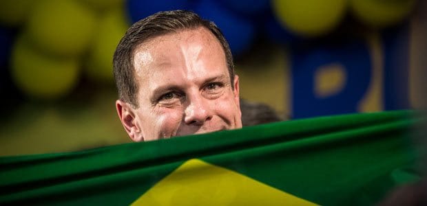 Algumas ruas da cidade de São Paulo estão com bandeiras do Brasil e cartazes com a frase Eu amo o BRASIL EAB, ao lado a propaganda do escritório do braço direito de Doria, o empresário Cláudio Carvalho, ex-secretário de governo.