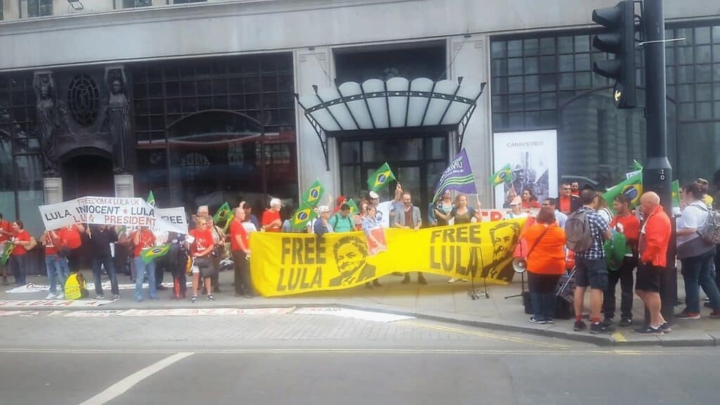 Da redação – Aproximadamente 80 pessoas estiveram ontem, dia 13, no ato em defesa da liberdade e candidatura de Lula em frente à embaixada brasileira em Londres (UK). O ato contou com a presença dos comitês Lula Livre e Freedom4LulaUK, do grupo NoCoupinBrazil – ligado ao Labour, dos sindicatos Unison -, reunindo os trabalhadores do serviço público no Reino Unido, do Unite – maior sindicato da Inglaterra -, de militantes latino-americanos e também de militantes do PT e PCO na capital inglesa.