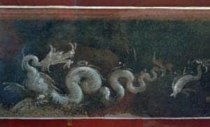Afresco do Templo de Ísis em Pompéia, representando um dragão marinho e um golfinho.