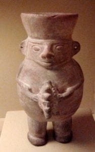 Cabeça encolhida, mumificada pelo povo Jivaro. Ao lado, Figura antropomorfa em cerâmica da Cultura Huari, 500-1200 d.C.