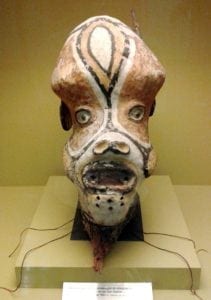 Boneca em cerâmica dos índios Carajás (Estatueta Litxocô), s.d; e máscara com representação de macaco dos índios Ticunas, do século XVIII/XIX.