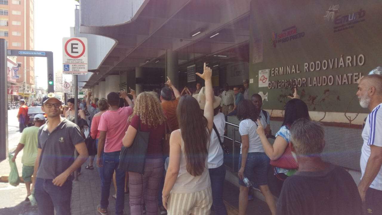 Ao som de Olê olê olê olá, um grupo começou a cantar e levantar os dedos em L, logo na entrada da rodoviária, às 13h em ponto.
