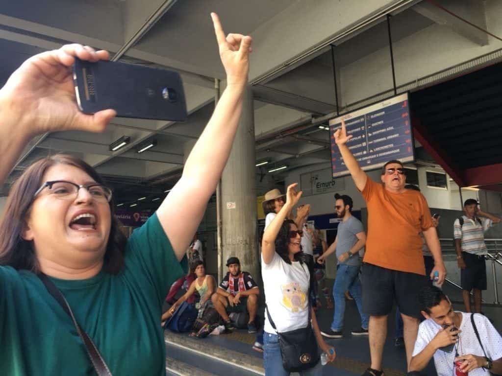 Ao som de Olê olê olê olá, um grupo começou a cantar e levantar os dedos em L, logo na entrada da rodoviária, às 13h em ponto.