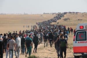 Palestinos se deslocando para as fronteiras orientais de Gaza para participar da marcha do retorno