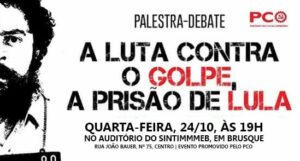No município de Brusque, no estado de Santa Catarina, o Partido da Causa Operária (PCO) irá realizar uma palestra-debate com o tema “A Luta Contra o Golpe e a Prisão de Lula”, com o objetivo de debater a situação política, os objetivos e as perspectivas para a esquerda e a luta contra o golpe.