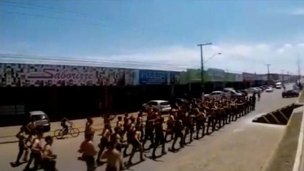 Da redação – Em vídeo conseguido pelo Congresso em Foco aparecem mais de 50 policiais militares de Goiasrealizando o treinamento de corrida na rua vicinal paralela à Avenida Alfredo Nasser, na cidade de Luziânia, a 60 quilômetros de Brasília, estão fazendo propaganda para o candidato do PSL à presidência, Jair Messias Bolsonaro