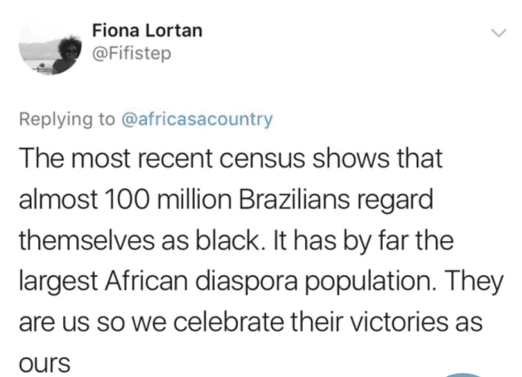 “O censo mais recente mostra que quase 100 milhões de brasileiros se consideram negros. Eles possuem de longe a maior população de diáspora africana. Eles são nós, então celebramos suas vitórias como as nossas.” diz Fiona Lortan.