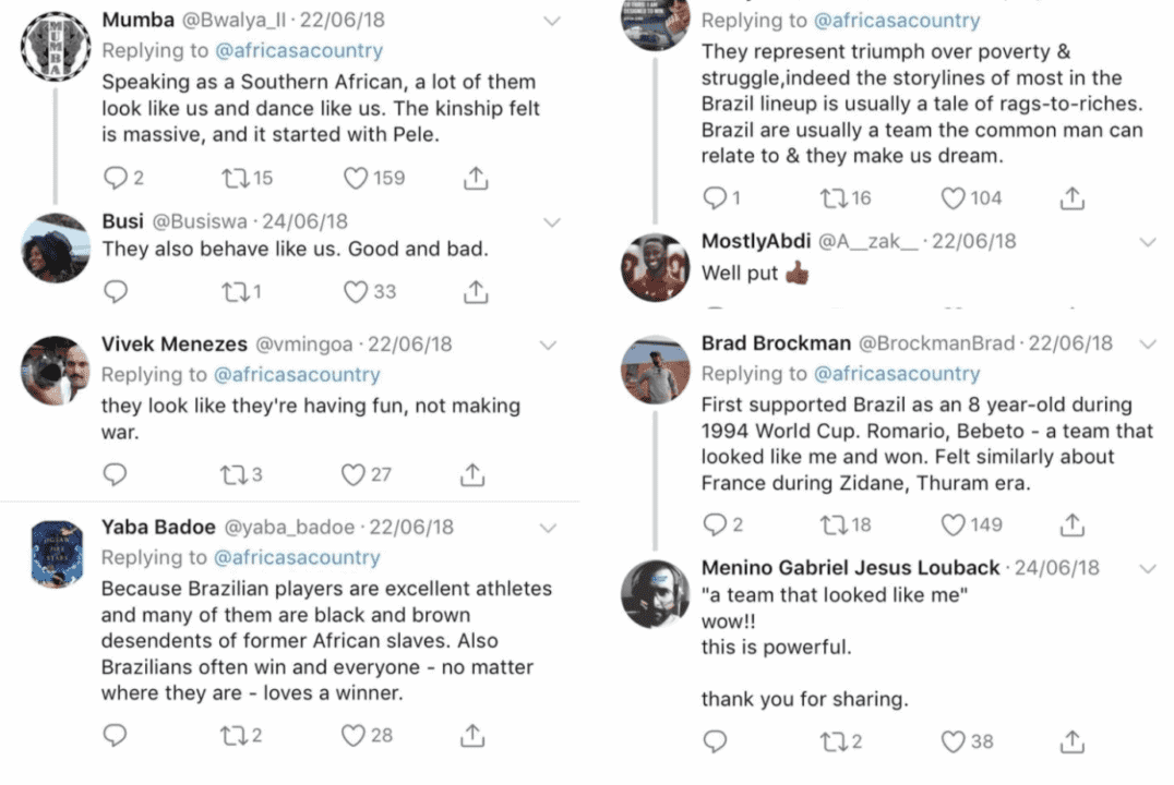 No Twitter, um usuário de nome “africasacountry” fez a seguinte pergunta para os milhares de usuários da rede social: “pergunto para um amigo africano, por que as pessoas do sul/terceiro mundo geralmente ficam tão felizes com a vitória do Brasil no futebol?”