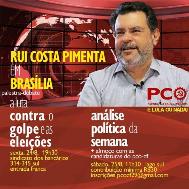 E mais: no sábado (25), às 11h30 da manhã, a tradicional e popular Análise Política da Semana será realizada também em Brasília, seguida de um almoço com os candidatos do PCO aos cargos do Distrito Federal. Confirme sua presença e apoie um dos grupos mais ativos da esquerda. Afinal, o PCO é o partido da luta contra o golpe.