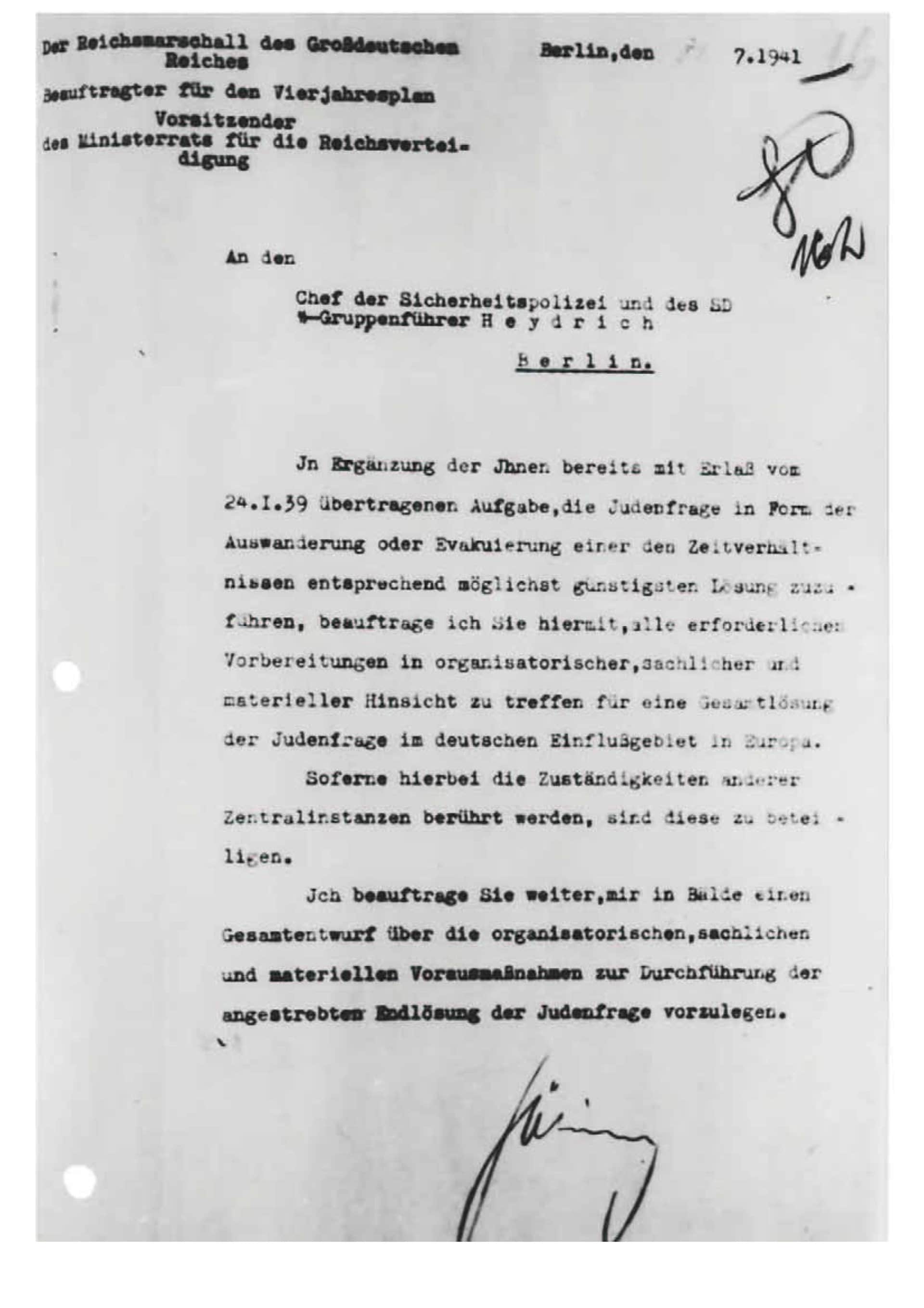Na carta, o comandante solicitara também a elaboração de “um plano geral” que mostrasse ”as medidas organizacionais, práticas e materiais necessárias à implementação da solução final da questão judaica que se pretende”.