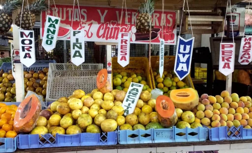 abundam nas mercearias, assim como frutas tropicais, destacando-se variados tipos de banana.