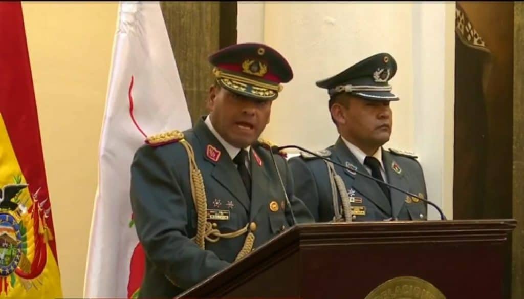 “De maneira conjunta  com a polícia boliviana executa-se um plano de operações para restabelecer a ordem pública em todo o território nacional, controlando os distúrbios civis […] com prisões e apreensões de quem alterar a ordem pública“, afirmou o novo chefe das Forças Armadas. Traduzindo, os militares estão atuando junto com a polícia para reprimir os manifestantes contra o golpe.
