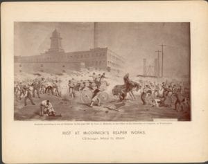 Em decorrência da paralisação, em Chicago, no dia 3 de maio, milhares de trabalhadores foram reprimidos quando se dirigiam para a fábrica McCormick, que, naquela greve, usou a mão de obra de fura-greves para evitar a paralisia total. Diante do avanço dos grevistas, agentes da Agencia Pinkerton e forças policiais locais dispersaram com tiros a multidão enraivecida, provocando 6 mortes e várias dezenas de feridos.