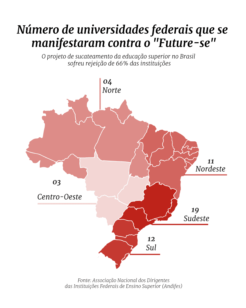 A grande maioria das universidades federais do país já se posicionaram em relação ao programa Future-se, do governo federal. A proposta de ingerência das instituições é total ou parcialmente rechaçada em quase 70% das instituições nacionais de ensino superior. Ao todo, são 43 das 63 universidades federais que já se negaram à incorporação voluntária ao programa do governo golpista de Bolsonaro.
