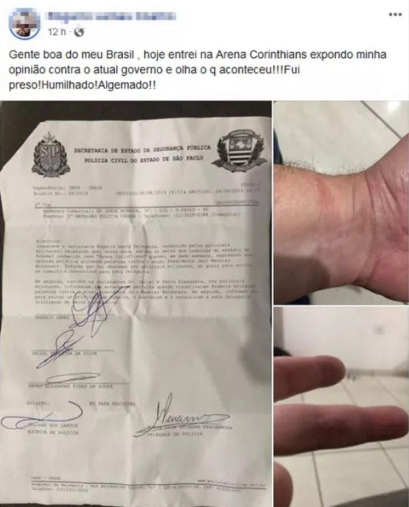 Na ocasião, após proferir algumas palavras de protesto contra o ilegítimo presidente, o torcedor foi imobilizado, com um mata-leão, algemado e arrastado pelos policiais para uma sala de detenção, na qual permaneceu durante praticamente todo o jogo. “Eu entrei na Arena, passei as catracas do Setor Norte e fui ali na direção do telão. Quando eu entrei, não lembro bem se já estava tocando o hino, eu levantei as mãos e comecei a gritar: ‘Ei, Bolsonaro, vai tomar no c…’ Quando eu comecei a fazer assim, não deu tempo de eu falar umas três ou quatro vezes, já veio um policial me sufocando, me dando um mata-leão. Eu fui desfalecendo, desfalecendo até que eu caí”, relatou o torcedor. Algemado, o corintiano, que tem uma prótese na perna esquerda, foi arrastado para uma sala sem água e jogado no chão. “Eles me fecharam na salinha começaram a me humilhar. Cada hora ia um lá, falando ‘você não é valentão?’. Eles me deixaram no chão em uma posição que a minha perna ficou virada, por causa da prótese. Eu pedia ajuda para sair da posição e eles só ficavam lá me olhando, me humilhando”, contou.