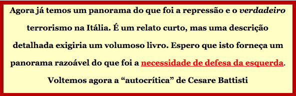 Em meu livro Os Cenários Ocultos do Caso Battisti relatei com algum detalhe os fatos de violência que aconteceram na Itália entre finais dos anos 60 e começos dos anos 80. Agora quero resumir apenas os assuntos principais que podem jogar luz sobre a inesperada autocrítica de Battisti, bem como das coerções que (de maneira irrefutavelmente provada) estão por trás dela.