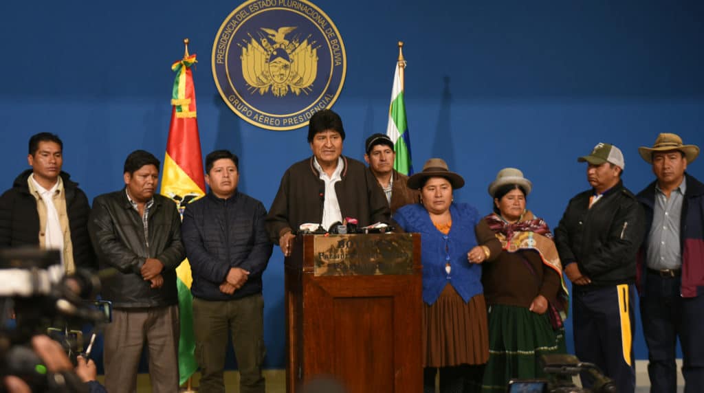 [5] Após esse ‘pedido’ de generais, Evo Morales e Alvaro García Linera, o vice-presidente, renunciaram, afirmando que o faziam para evitar um derramamento de sangue.