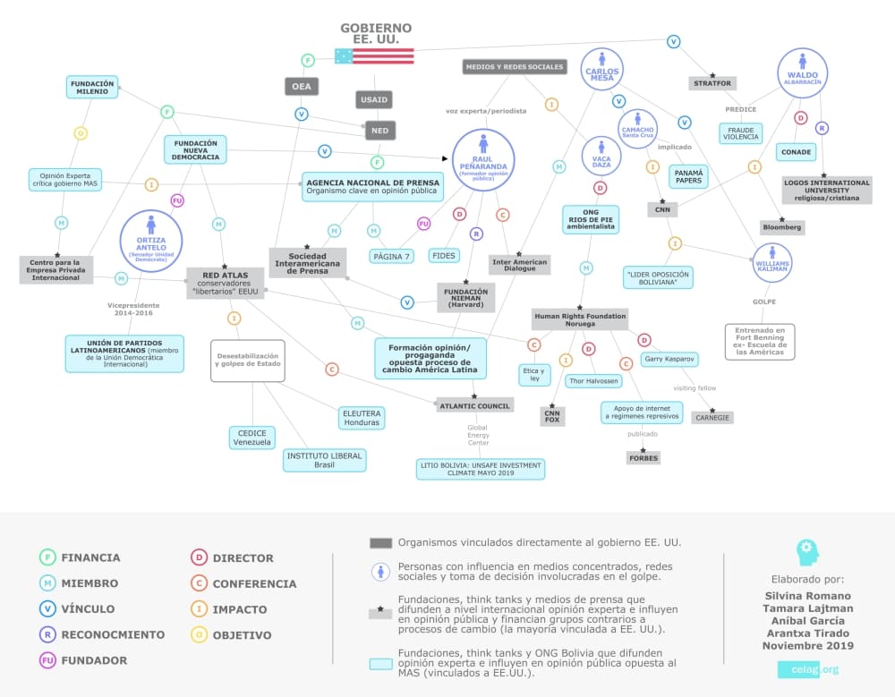 A já conhecida U.S. Agency for International Development (USAID)[7] tem um longo histórico no continente e está diretamente ligada ao grupo de direita que tentou dividir a Bolívia em diversas oportunidades. A USAID por sua vez, terceiriza o financiamento para outras instituições por meio da fundação National Endowment for Democracy (NED)[8].