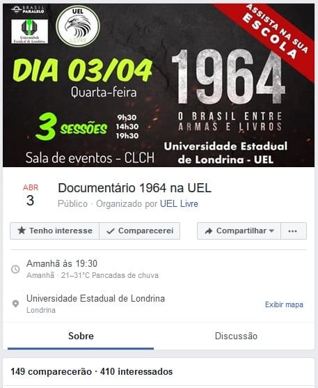 Durante a atualização desta matéria a redação tomou nota de que outro evento foi chamado para combater os fascistas e sua tentativa de exibição do filme, desta vez no Centro Politécnico da UFPR em Curitiba.
