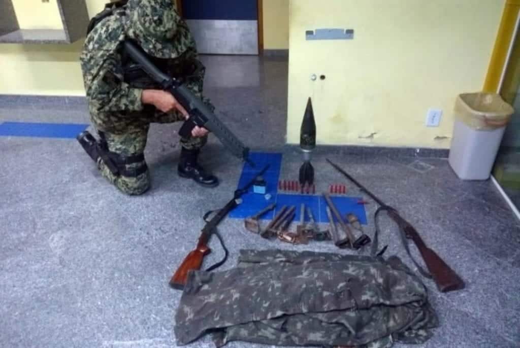 Nesta quarta (7), foram apreendidos uma munição de canhão EC-90mm, duas espingardas, oito trabucos de fabricação artesanal, dois fardamentos militares, além de outras munições.