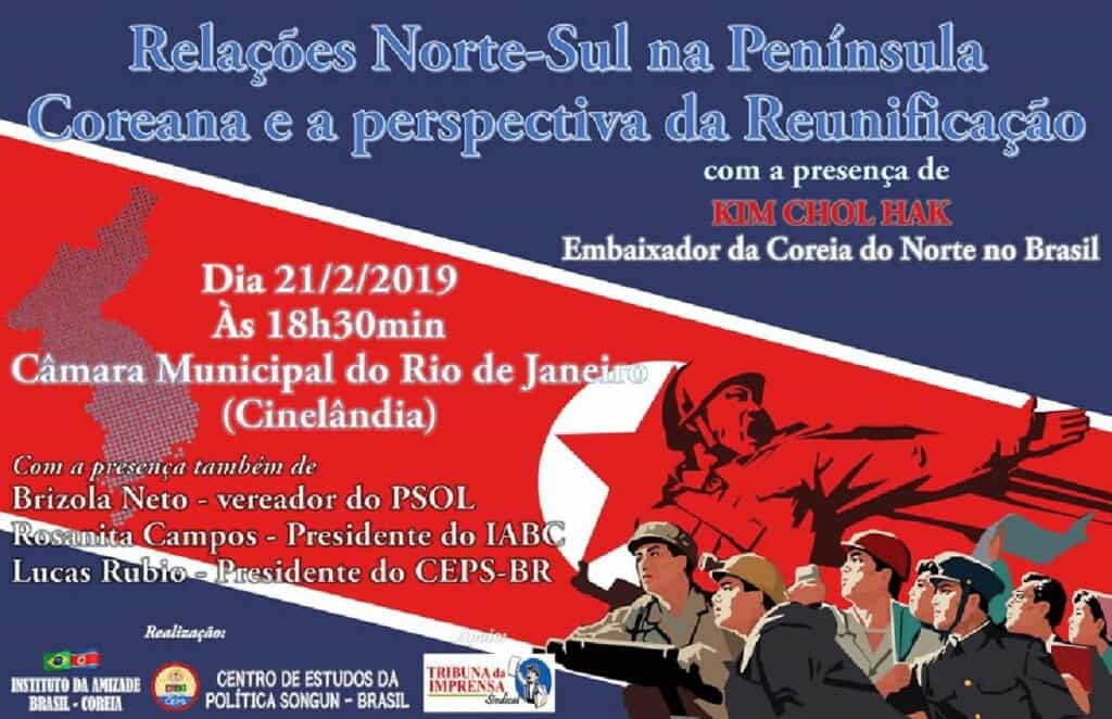 O evento ocorrerá na Câmara Municipal do Rio de Janeiro, na Cinelândia, e começará às 18h30. É realizado pelo Instituto da Amizade Brasil-Coreia, pelo Centro de Estudos da Política Songun-Brasil e pelo jornal Tribuna da Imprensa Sindical.