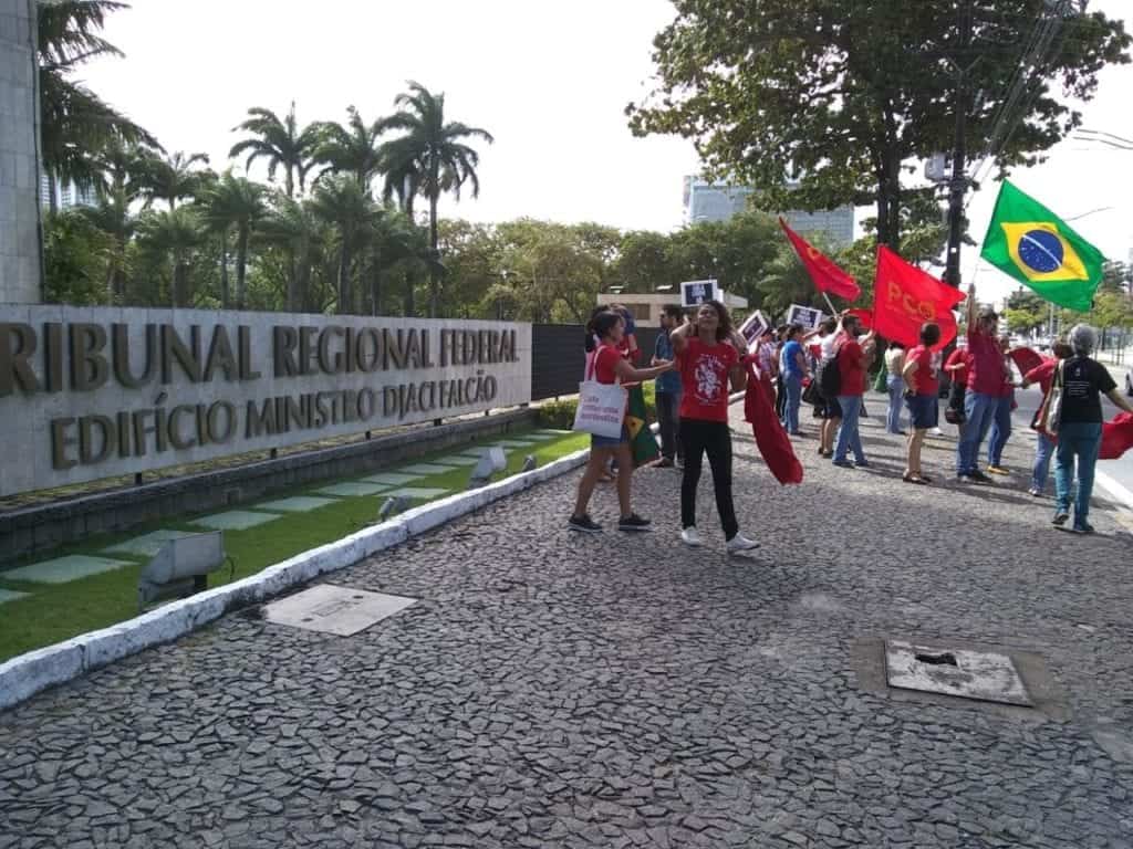No início da tarde de ontem (8), militantes e ativistas da luta contra o golpe estiverem presentes em mais um ato pela liberdade de Lula na cidade do Recife. O ato, que foi motivado pela ameaça de transferência do ex-presidente Lula para uma cela coletiva no estado de São Paulo, aconteceu em frente ao Tribunal Regional Federal da 5ª Região (TRF-5). O tribunal fica no bairro do Recife e abrange os estados de Alagoas, Ceará, Paraíba, Pernambuco, Rio Grande do Norte e Sergipe.