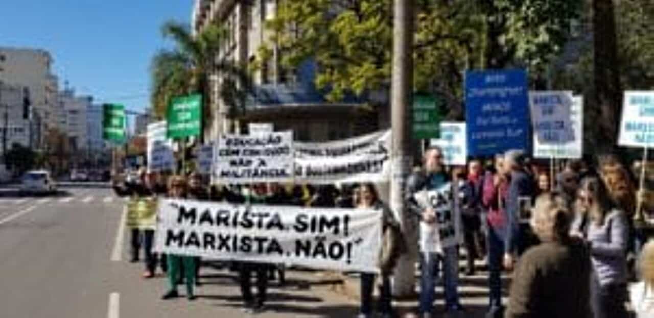 Membros do DEM, PSL e MDB, junto com pais direitistas partidários da suposta “escola sem doutrinação”, realizaram um protesto de uma hora de duração em frente ao Colégio Marista Rosário, no bairro Independência, em Porto Alegre. Levando faixas com os dizeres “Nossos filhos não são filhos do Socialismo, são nossos!! Não à doutrinação”, alegaram como motivação da manifestação, uma briga entre dois alunos, filmada e divulgada por Whatsapp, que teria ocorrido em uma aula-debate de sociologia que continha uma análise sobre a violência social, com citação dos números da violência policial.
