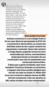 Mas a nossa querida “vlogger”, em sua aventura pelas redes sociais, foi contestada por uma seguidora no Instagram que ponderou suas dicas críticas apelando para o que deveria ser óbvio: que o movimento é democrático e que portanto todos os partidos de esquerda do PCdoB ao PCO têm o direito de se expressar. E mais ainda, a seguidora chama a atenção que essa política de “abaixar a bandeira” deu origem ao MBL e que foi o que favoreceu a infiltração da direita nas manifestações em 2013.