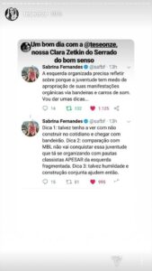 Sabrina Fernandes diz na postagem do Instagram que a “juventude tem medo da apropriação de suas manifestações orgânicas via bandeiras e carro de som” e que portanto dará importantes “dicas”. Ansiosos pelos seus ensinamentos tão valiosos, nós lemos que o problema é que os partidos políticos não “constroem no cotidiano” a mobilização, que falta até mesmo “humildade para construir em conjunto” e que por fim não podemos comparar os que têm uma política de MBL com o MBL por que isso não “conquista essa juventude”. O que seria de nós sem essas dicas tão descoladas e inovadoras?