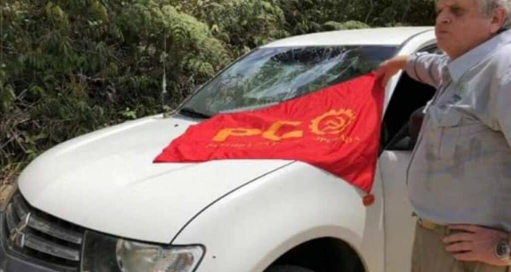 Os militantes foram protestar contra a entrega do patrimônio nacional. O ministro saiu correndo e forjou uma foto para provocar a esquerda. Colocou uma bandeira do PCO, que a polícia militar roubou de um militante, em cima do carro do ICMbio, que estava com vidro quebrado.