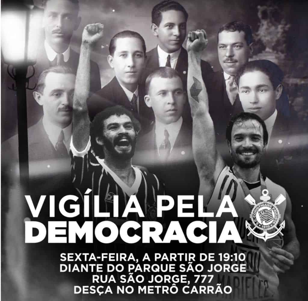 O Coletivo Democracia Corinthiana realizará na noite de hoje (2 de agosto), um evento chamado “Vigília pela Democracia”. A intenção é protestar contra a censura imposta pela diretoria do clube, que mandou retirar de seu memorial a camisa usada por Gustavinho, do time de basquete, com os dizeres: “Quem matou Marielle?”. Além disso, o coletivo também se colocou a favor da liberdade de expressão de um modo geral e da luta pela democracia.