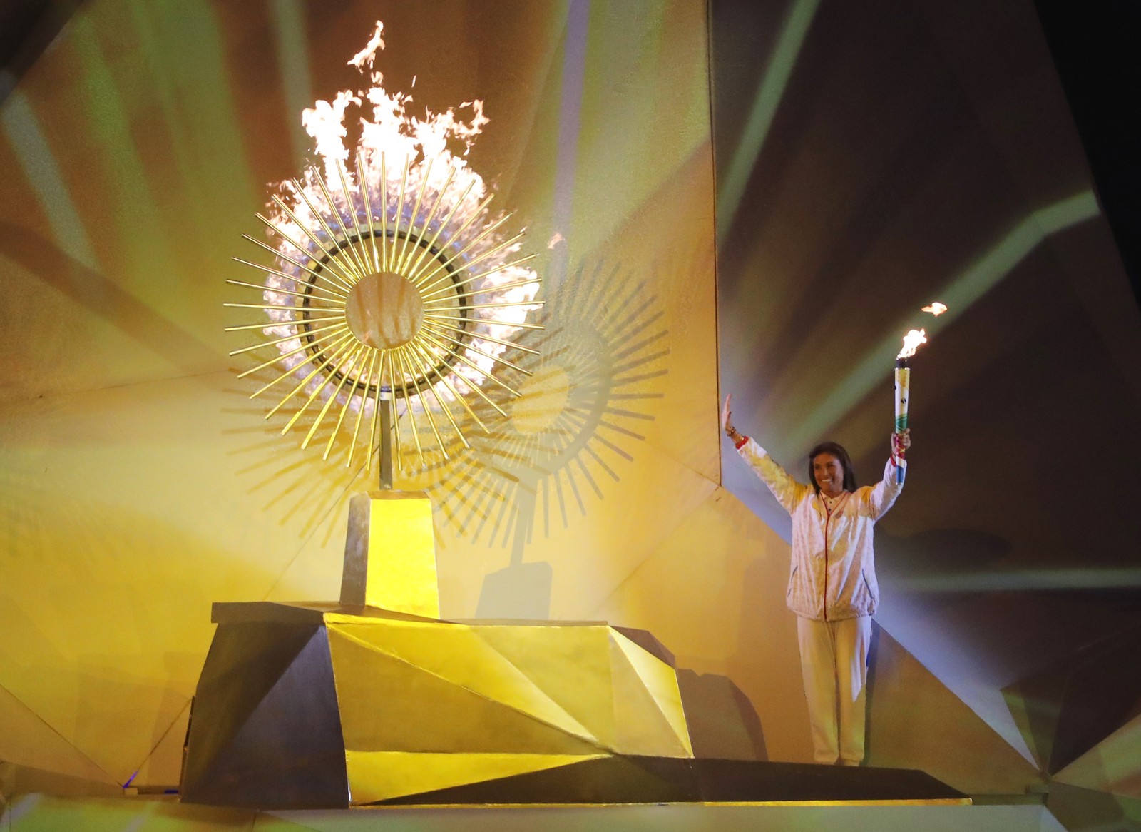 Cecilia Tait, ex-jogadora de vôlei peruana, acendendo a Pira Pan-Americana
