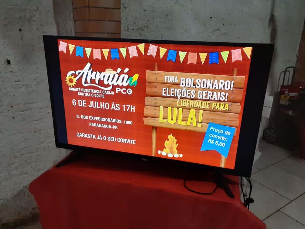 No Arraiá Lula Livre na sede do PCO em Curitiba, dia 29, a criançada teve a oportunidade de, com muita alegria, estourar o balão Fora Bolsonaro, além da tradicional pescaria. Os adultos puderam contar com um saboroso quentão para aquecer o frio curitibano nesse início de inverno, além dos demais pratos típicos.