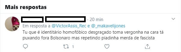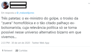 Outra ponte que podemos estabelecer entre o ataque do tuiteiro e o stalinismo são os comentários de seus apoiadores. O primeiro chama Victor Assis de “trosko”, que é um termo pejorativo pelo qual os stalinistas chamam os trotskistas. O segundo ataca agressivamente e sem argumentos o candidato do PCO.