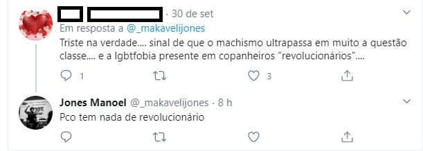 Os próprios seguidores de Jones Manoel estranharam o uso do termo “machismo” para atacar Victor Assis. Vários deles, de maneira sutil, corrigiram o youtuber e alegaram “homofobia” por parte do candidato do PCO. Tudo o que dissemos sobre o caráter moralista e idealista da acusação, vale também nesse caso. No entanto, chama a atenção que, pouco tempo depois de criticar Victor Assis, Jones Manoel mostrou qual programa defendia para os LGBTs:
