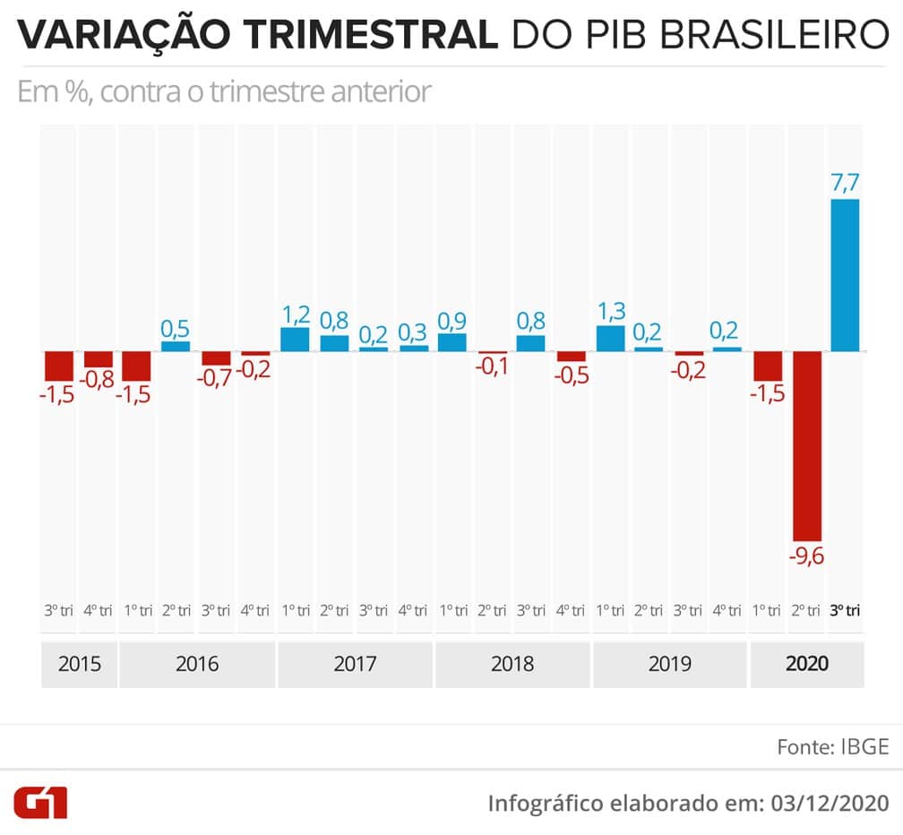 Uma controversa matéria do portal G1 da Globo destaca números surpreendentes da economia no 3º trimestre com um aumento do PIB em 7,7% em relação ao trimestre anterior. Ao mesmo tempo, dizem que esses números mantêm o patamar de 2017 e que de janeiro a setembro de 2020 a queda acumulada foi de 5% em relação a igual período de 2019. O maior crescimento ocorreu na indústria de transformação.