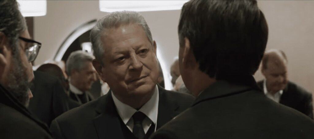 Al Gore se aproxima dos brasileiros dizendo ser amigo de Alfredo Sirkis, antigo dirigente do Partido Verde (PV) que faleceu há pouco mais de um mês. Bolsonaro, em resposta, afirma que foi inimigo de Sirkis na “luta armada” — isto é, durante a perseguição da ditadura militar ao movimento estudantil e à Vanguarda Popular Revolucionária (VPR), dos qual Sirkis fazia parte. Bolsonaro, então, aproveita a oportunidade para explicar que a história da ditadura no Brasil teria sido “muito mal contada”.