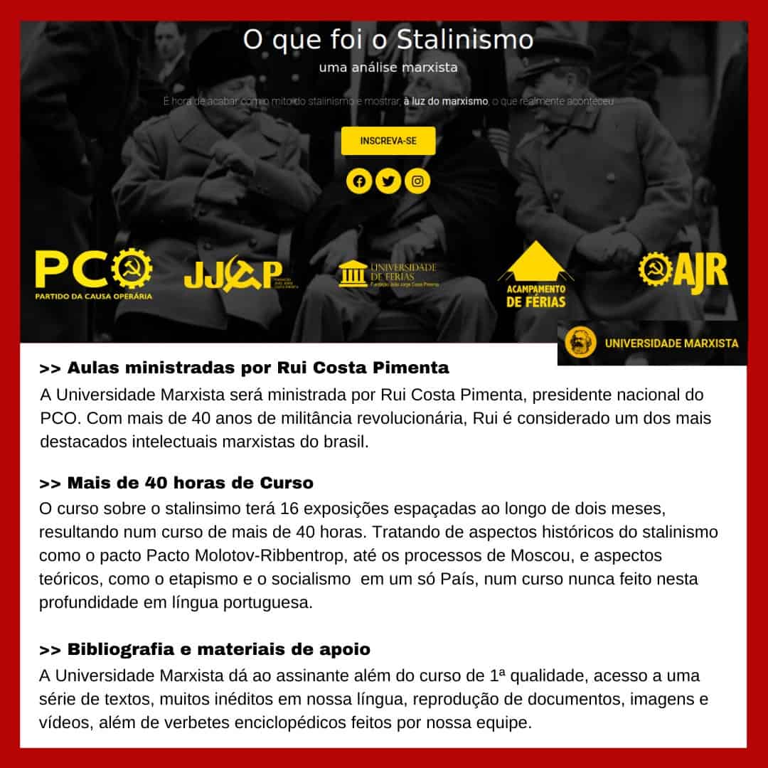Hoje foi lançado o vídeo de divulgação do curso “O que foi o Stalinismo” que o Partido da Causa Operária está promovendo, tendo início em janeiro. Toda terça e quinta, num total de 16 aulas, serão abordados os principais acontecimentos do século XX a partir de uma visão marxista. O problema do stalinismo percorre todo esse período e será destrinchado por Rui Costa Pimenta.