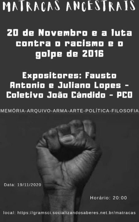 Nesta quinta-feira(19/11) o coletivo de negros João Cândido do Partido da Causa Operária, representado por Juliano Lopes, coordenador do coletivo e membro da direção do PCO, participará de um debate junto o escritor Fausto Antonio. A atividade em comemoração o dia 20 de Novembro debaterá sobre a luta contra o racismo e o golpe de 2016.