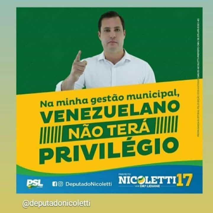 O candidato do PSL declara que em sua gestão, o “venezuelano não terá privilégios”. Na verdade, Nicotelli é um verdadeiro mentiroso golpista, pois os venezuelanos nunca tiveram privilégios e toda ajuda que receberam até hoje está prevista na constituição brasileira. O que ele não tem, e isso fica muito claro, é solução para o desemprego em Roraima, pois é financiado por empresários bolsonaristas, e traz propostas de gestão completamente impopulares, contrárias ao trabalhador.