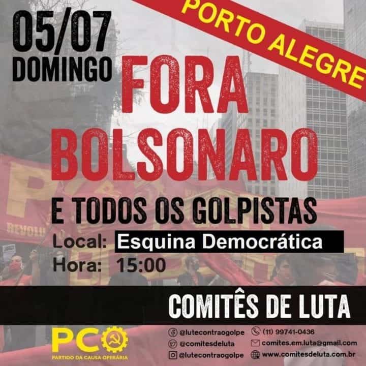 Partido da Causa Operária, os Comitês de Luta e os Conselhos Populares convocam todos para o ato que ocorrerá hoje na Capital Gaúcha, pelo “Fora Bolsonaro” e contra a presença dos fascistas nas ruas.