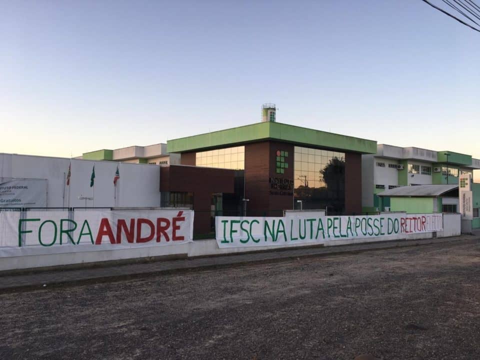 Em protesto contra a reitoria fascista, no qual fariam ato simbólico de posse do reitor que de fato foi eleito, manifestantes se depararam com elementos da típica inimiga do povo, a polícia militar, em frente à reitoria, reitoria esta que chamou a polícia para impedir a manifestação marcada para ocorrer no interior do prédio. A reitoria ainda buscou levar adiante ato de censura prévia pelo judiciário da campanha movida pela seção no IFSC do Sindicato Nacional dos Servidores Federais da Educação Básica e Profissional. A reitoria moveu inquérito contra a seção sindical, que acertadamente fez uma campanha pública contra a intervenção bolsonarista no IFSC espalhando outdoors, faixas e imagens na internet.
