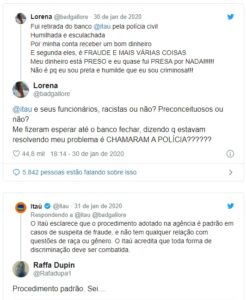 Em resposta ao caso o Itaú informou se tratar de um “procedimento padrão” em casos de suspeita de fraude e não tem qualquer relação com questões de raça ou gênero.