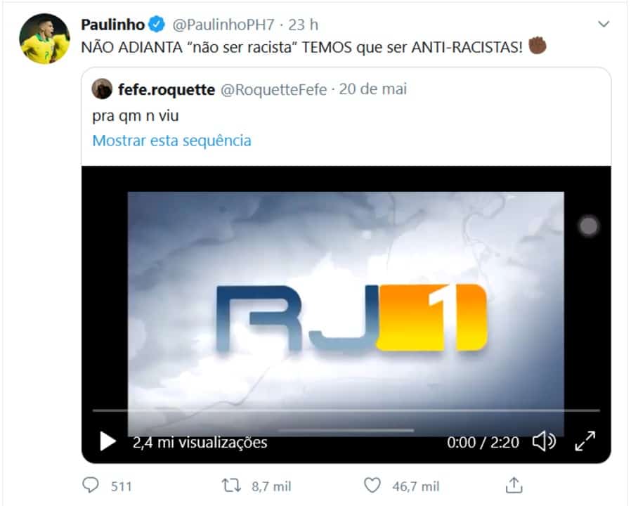 Nesta semana, o jogador Paulo Henrique Sampaio Filho, mais conhecido como Paulinho, divulgou em sua conta do Twitter uma contundente mensagem contra o racismo. Retuitando um trecho de reportagem exibida pela Rede Globo, o jogador escreveu: NÃO ADIANTA “não ser racista” TEMOS que ser ANTI-RACISTAS! Acrescentando um emoticon de punho cerrado, uma referência à famosa saudação dos Panteras Negras.