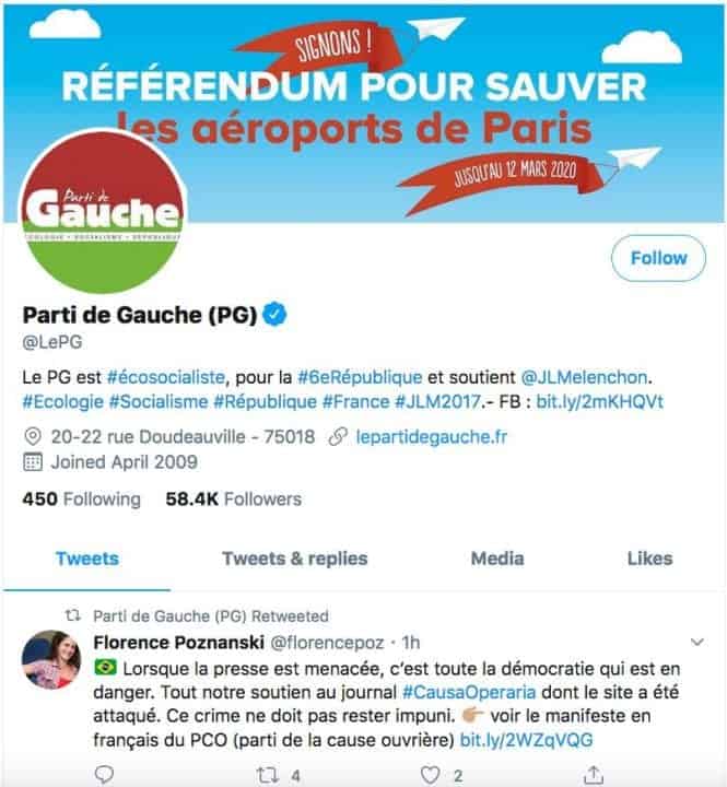 “Quando a imprensa é ameaçada, é toda a democracia que está em perigo. Todo nosso apoio ao jornal #CausaOperaria cujo site foi atacado. Este crime não pode ficar impune. Ver o manifesto em francês do PCO (Partido da Causa Operária)”