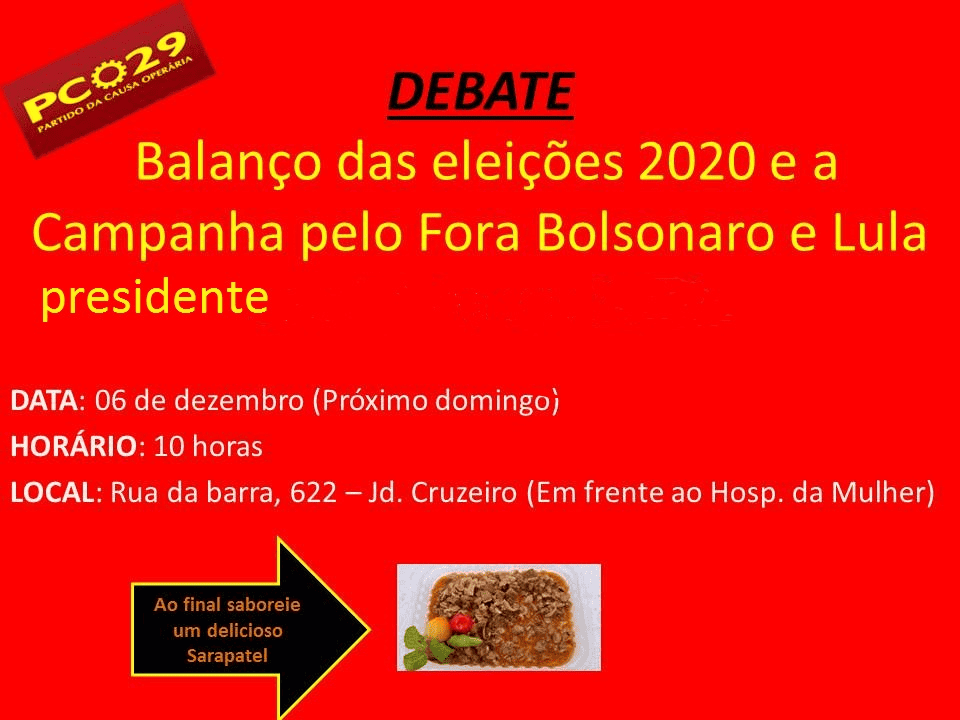O Partido da Causa Operária realizará no próximo domingo (06) convida os trabalhadores de Feira de Santana e região para discutir como foram as eleições na cidade e no restante do país, fazendo um balanço de todo o processo eleitoral.
